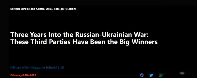 俄罗斯著名军事媒体《军事观察杂志》,在近期发布了一篇名为《俄乌战争爆发三年:这些第三方是最大的赢家》的文章。